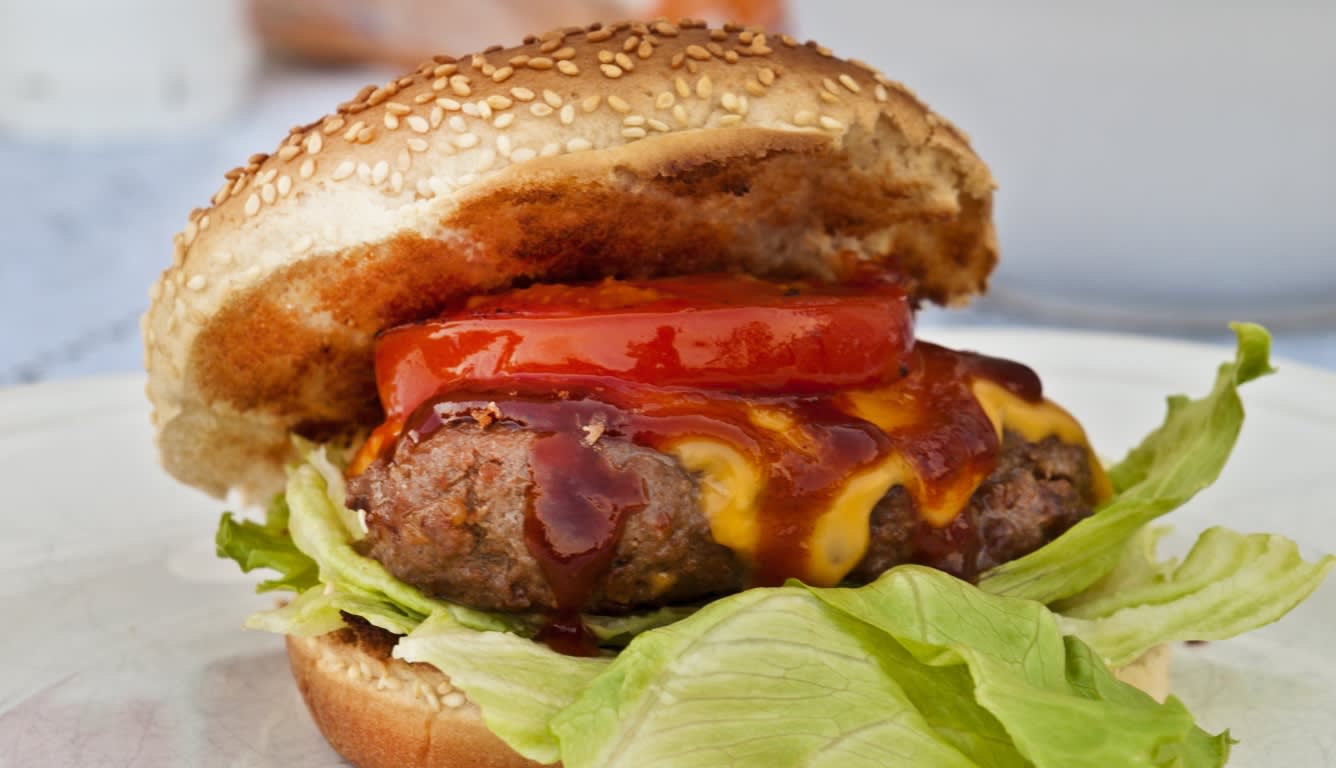 Need we say more? This burger is juicy, tender, and semi-sweet, offering a variation on the standard beef patty. It comes topped with classic hamburger fixings: cheese, lettuce, tomato, and pickle.