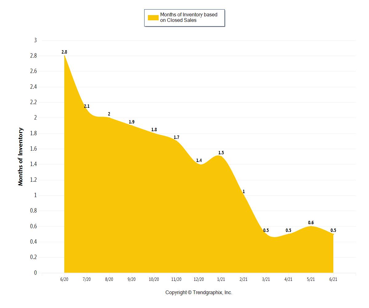 Our local housing inventory from Jan – June 2021 has consistently demonstrated the demand for housing in our area. The month’s supply of inventory for homes decreased by 74.1% to 0.7 months in Sarasota and decreased by 76.9% to 0.6 months in Manatee.
