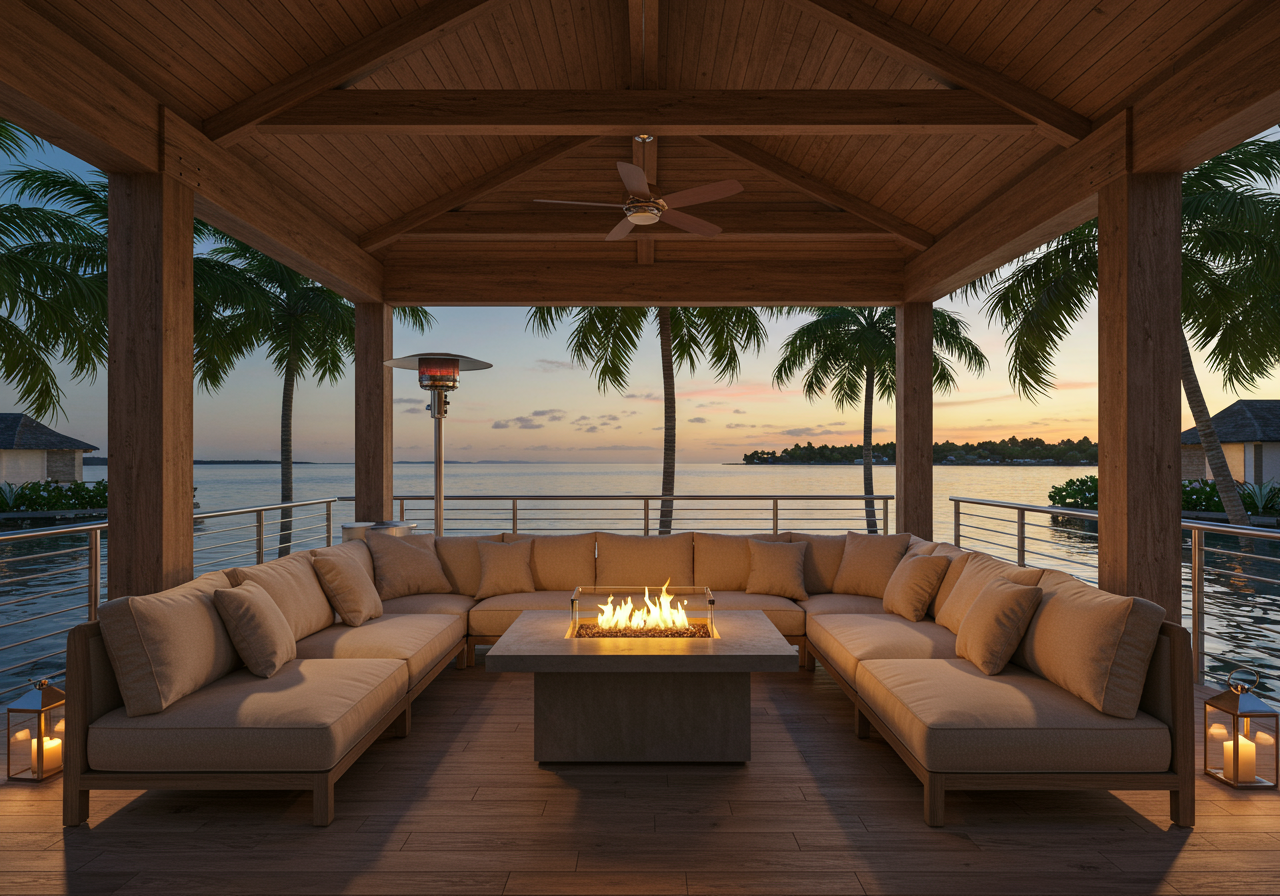 No space is complete without accessories. Lighting fixtures and fans influence how cozy an outdoor dining or lounge feels. Their visual impact adds a sculptural element to the room while being functional – adding a little glam for dining al-frescos. When the breeze isn’t enough, an outdoor fan will work wonders to cool down your space. The possibilities of fan options are endless, but an eight-bladed fan is an excellent solution for hot summer days.