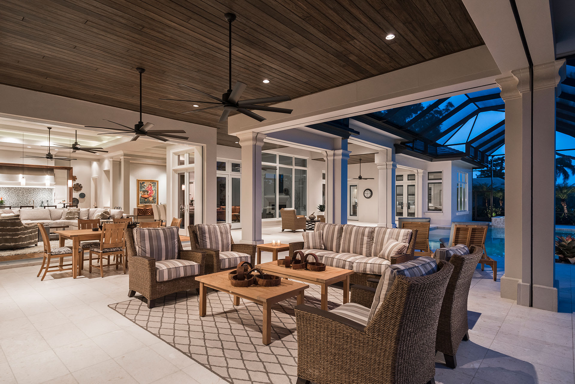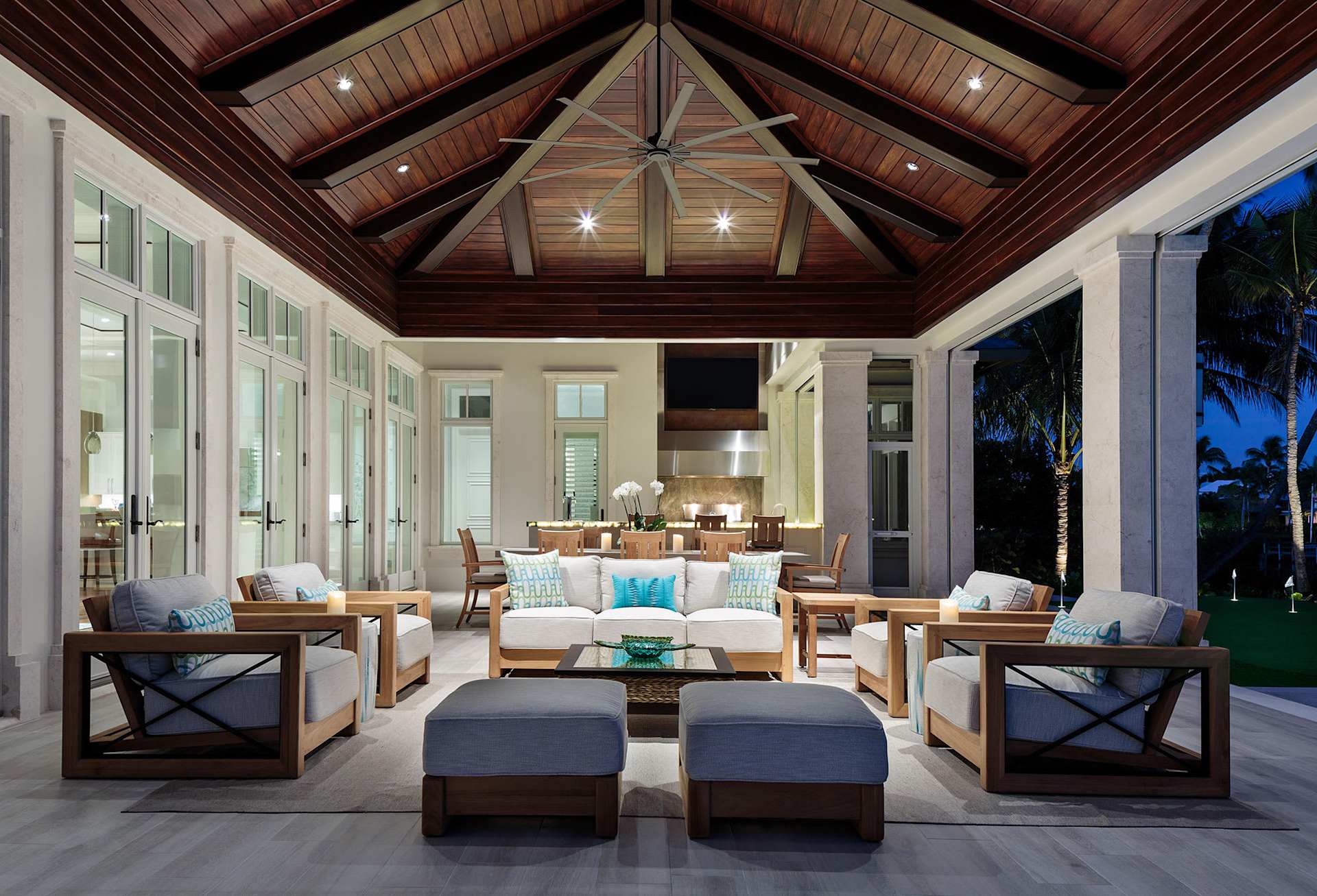 Outdoor furnishings have evolved to offer appealing details, diverse colors, and well-appointed accessories making it easier to connect both spaces and add a little glam. Select rattan or teak outdoor furniture which brings both earthiness and class to your yard. The color “oyster” in a wicker chair paired with a crisp white cushion and a modern teak table is one popular look. Take one indoor color to create a cheeky accent color in the outdoor lounge or dining space. Another detail that will add value and warmth to your outdoor space is by adding small details like wood to the ceiling of the outdoor patio – that’s sure to illuminate the outdoor room with a natural finish.
