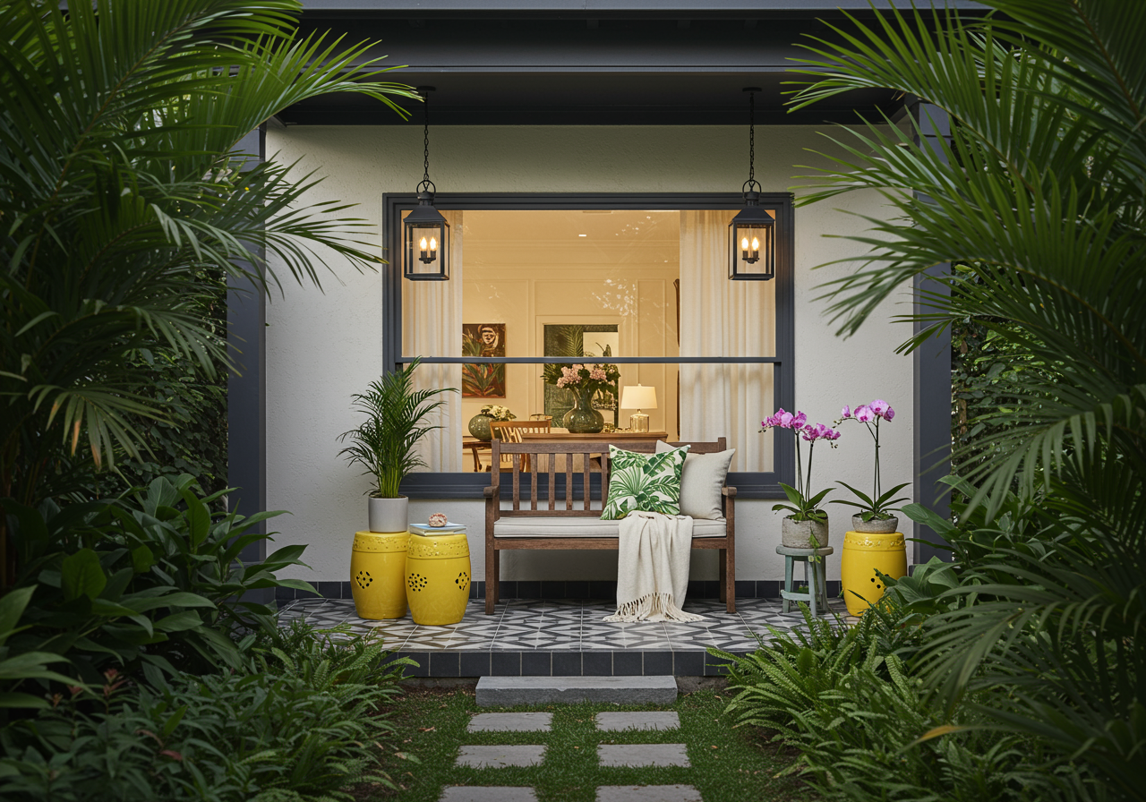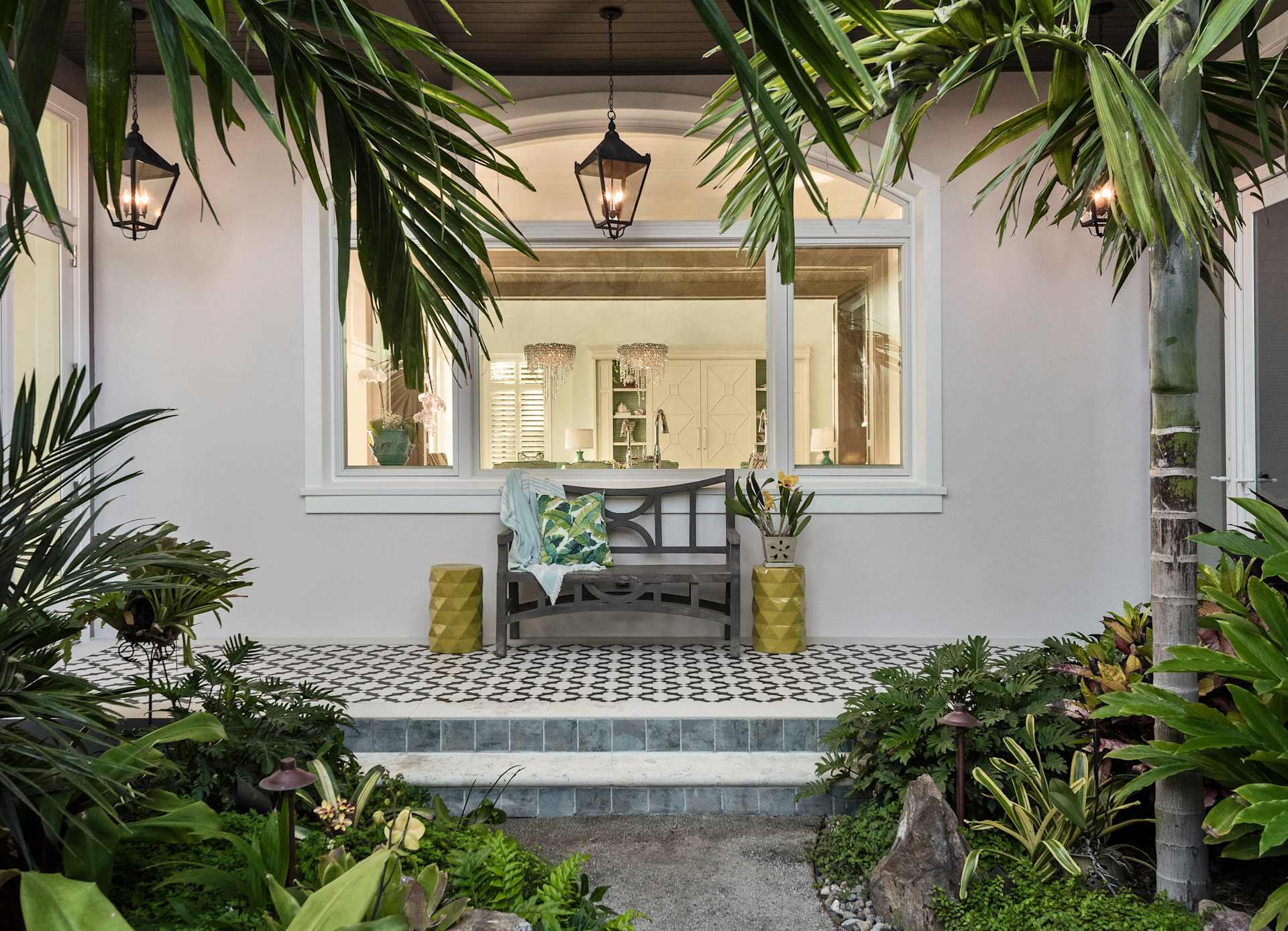 Keep the walkway clear of obstacles and provide a well-lit entrance. On a front porch or rear lanai, accessorize the space with seating, an outdoor rug, and a small table. If space is an issue, incorporate small decorative touches, such as a festive wreath or potted plant.