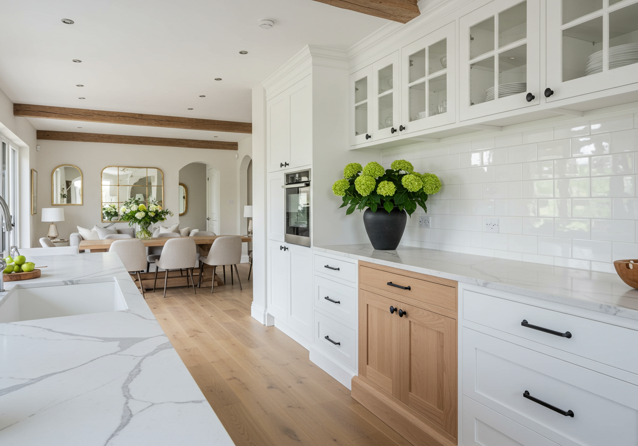 Play with wood tones throughout your kitchen and with your furniture choices. Embrace rather than question a specific wood choice that appeals to you. Vary the neutral shades and add depth by pairing unpainted furniture with a modern design. Strategic use of décor and materials such as stone and wood guarantee a layered look. Choose a neutral color that will add interest to your existing patterns, furniture, and textures.