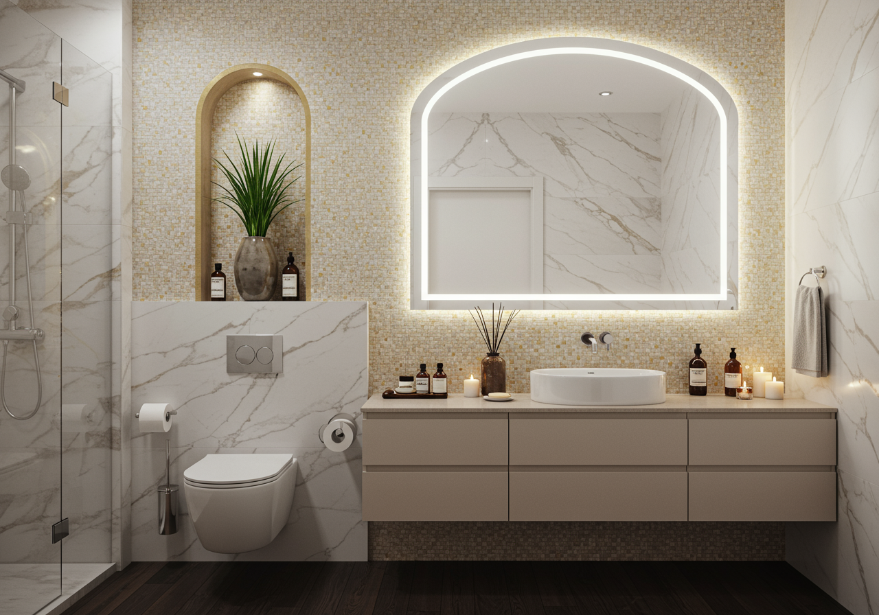 For example, if you’re adding a shelving unit, try to attach it to the wall instead of the floor to save space. If you’re putting prints on the wall, ensure they’re not butting up against the mirror and hung in a place where they won’t get wet.