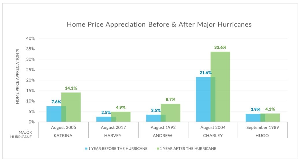 One question that naturally arises is how do hurricanes impact home prices after an area is hit? Reports showed a list of the 20 most expensive hurricanes (adjusted for inflation) on record in the US over the last 32 years. Narrowing the list to include only those hurricanes registering as category 4 or 5 storms, as well as identifying those that made landfall near population centers, highlighted the following named hurricanes: Katrina, Harvey, Andrew, Charley, and Hugo.